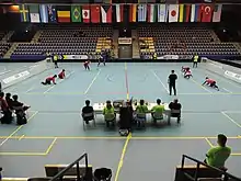 Japan (left of table) throwing to Russia (right of table) women's goalball teams. World Goalball Championships, Malmö, Sweden (June 2018).