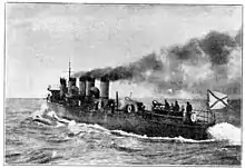 The Japanese ships ceased fire and gathered around the destroyers′ flagship Usugumo, finding that Usugumo and Shinonome had sustained only minor damage, Sazanami had suffered eight shell hits and Akebono had taken about 30 hits, and the Japense destroyers had suffered a number of killed and wounded. The Japanese attempted to take possession of the Russian destroyer, but Steregushchiy′s crew had opened her Kingston valves to scuttle her, and two members of her crew locked themselves in her engine room to prevent the Japanese from closing the valves, sacrificing their lives to ensure that she sank.[4] At 08:10, a Japanese tug arrived, and Sazanami began an attempt to tow Steregushchiy to port. At around the same time, however, the Russian armored cruiser Bayan and protected cruiser Novik approached under the personal command of the commander of the Russian First Pacific Squadron, Vice admiral Stepan Osipovich Makarov, and the Japanese abandoned their towing attempt, rescued Steregushchiy′s four surviving crew members – Khirinsky, Osinin, Novikov, and Acting Boatswain Fyodor Yuryev – and withdrew to avoid combat. At 09:07, Steregushchiy sank 7 nautical miles (13 km; 8.1 mi) southeast of Mount Laoteshan and 6 nautical miles (11 km; 6.9 mi) from the Lushun Lighthouse with the loss of 49 members of her crew.[4][5]