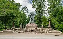 On 23 May [O.S. 10 May] 1911,[6] a monument dedicated to Steregushchiy′s loss in action was opened in Alexander Park on Kamennoostrovsky Prospekt in St. Petersburg in the presence of Emperor Nicholas II. The sculptor Konstantin Vasilievich Isenberg[7] and the architect Aleksandr Ivanovich von Gauguin designed the monument, Professor V. N. Sokolovsky made the calculations for its foundation, and V. Z. Gavrilov cast the sculpture.[8] The monument depicts two sailors – V. Novikov and I. Bukharev – opening Steregushchiy′s Kingston valves to scuttle her and prevent her capture by the Japanese. In May 1911, the Russian magazine Iskra published photographs of the monument's opening ceremony, with a caption under one of them reading "The monument to the heroes of the destroyer 'Steregushchiy' opened on May 10 in St. Petersburg in the Highest Presence with a stream of water pouring from an open porthole."[9]