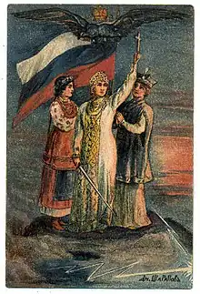Russian nationalism (Russian: Русский национализм) is a form of nationalism that promotes Russian cultural identity and unity. Russian nationalism first rose to prominence as a Pan-Slavic enterprise during the 19th century Russian Empire, and was repressed during the early Bolshevik rule. Russian nationalism was briefly revived through the policies of Joseph Stalin during and after the Second World War, which shared many resemblances with the worldview of early Eurasianist ideologues.[1]