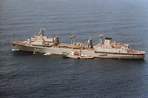 The ship was laid down on 18 August 1972 at the Shipyard named after 61 Communards, Nikolaev, Ukrainian SSR, USSR. Launched 20 April 1975. On 30 December 1975, the ship was commissioned as part of the Black Sea Fleet of the Soviet Navy and was based in Sevastopol.[2] Berezina was heavily armed for a supply ship of the era. Berezina was armed with Osa-M surface-to-air missiles, 57 mm/80 cal AK-725 dual-purpose guns, RBU-1000 anti-submarine rockets and an AK-630M point defense system.[3] Uniquely, in 1986 it was said that Berezina was probably the only auxiliary ship of any nation fitted with sonar and anti-submarine weapons.[4] In 1979, western media reported that it was suspected that four Berezina class supply ships would eventually be built.[5] Only one was completed.