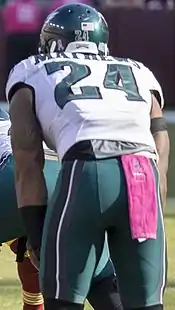 Mathews signed a three-year deal with the Philadelphia Eagles on March 12, 2015.[72] However, the Eagles also signed NFL rushing champion DeMarco Murray and already had Darren Sproles, who scored six rushing touchdowns on limited carries in 2014.[73][74] However, Murray played poorly in the first two games of the season against the Atlanta Falcons and Dallas Cowboys, rushing for 11 yards on 21 carries, although Mathews was not much better, rushing for four yards on four carries and one touchdown, while Sproles led the team with 46 yards on six carries.[75][76] When Murray went down with a hamstring injury in week 3, Mathews stepped up against the 2–0 New York Jets and rushed for 108 yards on 24 carries while catching a 23-yard receiving touchdown.[77] When Murray returned in Week 4, Mathews was again the backup, while Murray had another sub-par game against Washington.[78] In Week 5, Murray rushed for 83 yards on 20 carries leading the team in rushing, but Mathews was only ten yards behind with only eight carries, and he also had a touchdown. Mathew's best performance was against the then undefeated Carolina Panthers, where he rushed for 97 yards on six carries.[79] Mathews' chances of starting were damaged when he was knocked out with a concussion in a 20–19 loss to the Miami Dolphins, which led to Darren Sproles becoming the feature back.[80] Upon his return, he played on an average level, but had a good game against the 11–2 Arizona Cardinals (11 carries for 58 yards) and finally won the starting job.[81] Ultimately, he lost his starting job to DeMarco Murray in a Week 16 loss to the Redskins, where he had four carries for five yards and a touchdown.[82] Through an up and down season, Mathews finished by leading the team in rushing touchdowns with six, as well as compiling 539 rushing yards on 106 carries, a 5.1 average.[83][84]