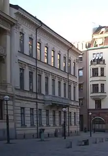 On 31 March 1870 Sällskapet relocated into a new purpose-built clubhouse in central Stockholm,[1] on the opposite bank of the river from the Swedish Parliament and the Royal Palace. The Club remains at this location, No 7 Arsenalsgatan, to the present day. The architect was Johan Fredrik Åbom, a leading proponent of his art in mid-nineteenth century Stockholm. Åbom had also designed the world-renowned Hotel Rydberg (where the Club then met), whose banqueting hall was considered one of the greatest architectural triumphs of nineteenth century Stockholm, and which gave its name to the now classical Swedish dish "Biff Rydberg".[2] The members commissioned Åbom to construct a clubhouse including an exact replica of the Hotel Rydberg banqueting hall. As the hotel no longer exists, the main dining room at Sällskapet is the only place where Biff Rydberg may be eaten in its original setting.