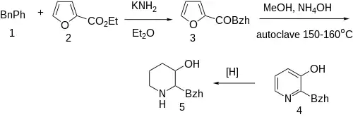 Potassium amide was made from the reaction of potassium metal with liquid ammonia. The coupling between the carbanion created from diphenylmethane [101-81-5] (1) and ethyl 2-furoate [614-99-3] [1335-40-6] (2) gives 2-furyl benzhydryl ketone, CID:63950182 (3). This was reacted with concentrated liquid ammonia in methanol solvent in an autoclave. The product of this step was 2-benzhydrylpyridin-3-ol, CID:125491889 (4). Reduction of the pyridine gave 2-(diphenylmethyl)piperidin-3-ol, CID:209477 (5).