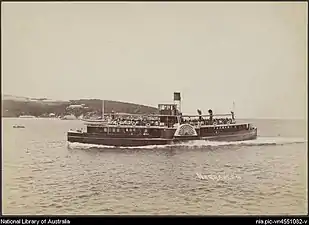 On 22 August 1898, the ferry Narrabeen left Manly at 07:15 and ran into a dense bank of foe shortly after leaving, and had to slow down and proceed cautiously up the harbour.[21] After leaving the lightship nothing was seen till the lookout called 'full speed- astern,' and then was seen the stone wall of Garden Island a few yards ahead.[21] Speed had just been got on the boat again after backing out, when the cry again came to go astern. This time it was too late, as there was seen coming around the corner of the island the Government steamer Kate towing a powder lighter bound for Broken Bay.[21] The Narrabeen struck the Kate just forward of amidships, tearing a large hole in the woodwork.[21] The engines of both steamers were going astern. The captain and crew, of the Kate scrambled aboard the Narrabeen with the Kate soon disappearing stern first.[21]