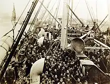 Manchuria was acquired by the Navy from the United States Shipping Board on 10 April 1918 and commissioned USS Manchuria (ID-1633) at New York on 25 April 1918 and assigned to the Cruiser and Transport Force.[32] Manchuria departed New York with a convoy on 30 April with the 18th Field Artillery and the 153d and 154th Infantry Battalions embarked for Europe arriving in Saint-Nazaire, France, on 13 May to debark her passengers.[32][33] Five days later she returned to the east coast, arriving at New York on 30 May.[32]