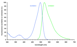 SYBR Green I (SG) is an asymmetrical cyanine dye[1] used as a nucleic acid stain in molecular biology. The SYBR family of dyes is produced by Molecular Probes Inc., now owned by Thermo Fisher Scientific. SYBR Green I binds to DNA. The resulting DNA-dye-complex best absorbs 497 nanometer blue light (λmax = 497 nm) and emits green light (λmax = 520 nm). The stain preferentially binds to double-stranded DNA, but will stain single-stranded (ss) DNA with lower performance. SYBR Green can also stain RNA with a lower performance than ssDNA.