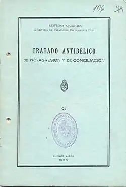 The Anti-war Treaty of Non-aggression and Conciliation (also known as Saavedra Lamas Treaty) was an inter-American treaty signed in Rio de Janeiro on October 10, 1933. It was the brain-child of Carlos Saavedra Lamas, who was the Argentine Minister of Foreign Affairs at the time the treaty was concluded. It was signed by representatives of Argentina, Brazil, Chile, Mexico, Paraguay and Uruguay. The US government acceded to the treaty on August 10, 1934. The treaty went into effect on November 13, 1935. It was registered in League of Nations Treaty Series on November 28, 1935.[1]