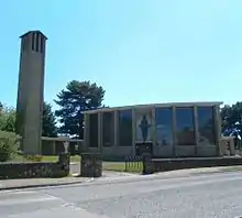 In 1957, construction on the Church of the Divine Motherhood and St Francis of Assisi began. In 1962, the church was opened. In 1965, a sculpture of Madonna and Child by Richard Guyatt was installed above the main entrance. In May 1966, the church was consecrated. The church, without its tower, cost £35,000.[8] The furniture and interior decoration was not done by the architect, Guy Morgan, and he complained that his "design has been murdered … the terrible seats, ghastly altar and the awful side chapels … all this has nearly broken my heart."[9] Yet, the church was listed as a Grade II building, because of its fittings, design and sculpture.[5] Inside the church there is chapel dedicated to the Passion and altars dedicated to St Francis of Assisi, St Patrick, and Blessed Margaret Pole. A sculptor from Sussex, Michael Clark, designed the crucifix in the church.[3]