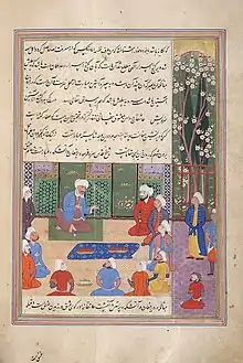 "Shaykh Safi al-Din interpreting for his disciples various verses by distinguished poets." Folio from a revised, Safavid-era edition of the Safvat al-Safa, the only extant illustrated copy of the work. Created in Shiraz, dated September 1582.