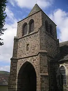 Now off-center on the western edge of the "balcony village" of Cheylade, the church overlooks the valley[37] and, like many others in Auvergne, has a short, squat silhouette:[38] its eight-bay bell tower, topped by a low, four-sided spire, towers just above it.[13] The edifice is built entirely of rhyolite, a volcanic rock whose color varies from gray to pinkish beige, while the steep roofs are covered with phonolite flagstones, a igneous rock with an almost crystalline sound.[10]