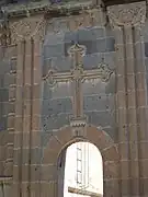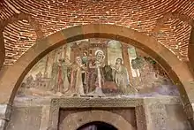 An airy, triple-arched portico was added to the western façade of the church in 1683 as the burial place for prominent Armenian clergymen. The gallery is made up of five distinct yet continuous bays, each being open and linked to the one adjacent. Its three central bays have vaulted ceilings and large arched openings that lead to the exterior courtyard. The two side bays are slightly lower in height and are vaulted as well. Each is surrounded by walls at three sides with small quatrefoil windows placed on the exterior walls. Frescos of clergymen adorn niches along the interior walls of the portico while saints are depicted on the fresco of the tympanum above the main door. Six-columned cupolas sit on the roof above the two end bays and may be seen from the exterior.