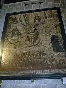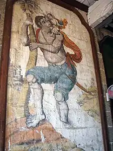 The large wall paintings on wood panels inside the church were executed by another notable son of Paete, Luciano Dans. These depict Langit, Lupa, Impiyerno - Heaven, Earth, Hell - and large murals of Saint Christopher. Dans used natural color pigments mixed with volcanic ash and brushes made from cats' hair to create the murals.[9] The large painting of San Cristobal on wood was purchased during the time of Father Francisco de Santa Gonzaleza for ₱22 in October 1852.[5] Unfortunately, the two St. Christopher paintings currently need immediate conservation.: a lot of wood panels inside the church, including the painted wood panels, are infested by termites.[10][11]