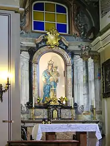 The entrance to the church is located between two pilasters. Above the door there is a plaque whose inscription commemorates the dedication to Mary Immaculate, Saint Joseph, Saint Mary Magdalene, Saint Teresa of Ávila that took place in 1691.[1][2] The church is quadrangular with a rectangular apse where a late baroque marble altar is placed; the altar has a curvilinear shape that follows the slight concavity of the junction between the bottom wall and the side walls. In a niche above the altar there is a twentieth-century statue of the Madonna and Child. A marble altarpiece with a molded cornice frames the niche, inserted within a decoration depicting eighteenth-century columns and garlands of flowers, which itself gives the impression of greater depth.