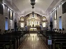 Through the efforts of Fr. Augusto Jesus B. Angeles III, the 400-year-old limestone church was restored in a 15th-century setting. The flooring consists of the same baldozas mosaicos or machuca tiles, specially fired and featuring the same design. Wooden doors and benches are made of yakal, featuring sculpted banyan tree leaves. The windows are handcrafted and fired by Kraut Art Glass with a modern and symmetrical design. Chandeliers and ceiling murals were commissioned pro bono by Hermes Alegre, a visual artist from the Philippines. These works were made possible by the donations of a few families in Vinzons, such as the altar with Italian granite flooring. The church's pulpit was also restored using the wooden materials which survived the fire that gutted it.