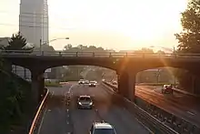 On January 6, 1958, the first 1.2-mile-long (1.9 km) section of the East–West Expressway was opened between Cloverdale Avenue and Main Street.[10][11] Because of the novelty, local newspapers ran a series of stories and diagrams on how to use the expressway, educating the public on how on-ramps and off-ramps work.[8] Designated as I-40, the expressway soon ran concurrently with US 158 in 1959, from Stratford Road to Marshall (westbound) and Cherry (eastbound) streets.[12] In 1960, the expressway was extended west into Yadkin County, at NC 801, and east to Reidsville Road.[13] In 1961, US 421 was rerouted from Pfafftown and downtown Winston-Salem onto new freeway that connected directly with the expressway, then continued easterly running concurrently with I-40.[14] In 1962, US 158 was realigned to continue along the expressway to Reidsville Road, its former alignment became US 158 Business (decommissioned in 1970). East of Reidsville Road, I-40/US 421 was extended onto new freeway to Kernersville, where it then linked with second built section of I-40 (late 1958) and continued towards Greensboro.[15]