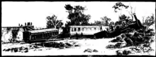 The number of stops made by this train between Albury and Wagga is not recorded, but those succeeding are known with some certainty: They left Wagga Wagga at 17:15 in heavy rain, Junee junction at 18:20[12] or 18:30,[13] Illabo at 18:55, and Bethungra at 19:14, the driver having been given the "all clear" by the station-master.[13] At 19:45 it was not yet dark, when coming around a slight curve the driver saw that the track was totally submerged under the fast-flowing creek. He applied the air brake and reversed the engine,[5] but too late.[13] The rails and sleepers, no longer supported, gave way, and one or more carriages were derailed. The engine and its tender almost made it to solid ground, but lost traction and fell back on the second-class carriage. The coupling broke and that carriage skewed around, collapsing into the stream, while the following cars fell on their sides, the sleeping car being unroofed. The first-class carriage, having smashed into the sleeping car,[5] was flooded but remained intact, however the mail van following was smashed to bits. The brake van survived but sunk into the stream.[14] Moodie was reported as saying the crash might have been averted if he had never applied the brake,[15] later disavowed.[16]