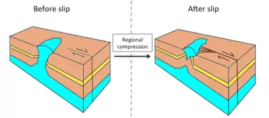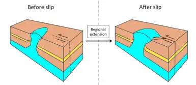 2 | Preexisting | Localized extension | Widening of diapir, diapir can fall if the rate of salt supply is not enough to support the weight of the overlying rock,[16] but will rise if there is sufficient salt supply to push up the overburden[1] | ![]() Left lateral shear, salt layer is marked in blue |