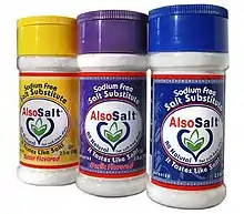 A salt substitute, also known as low-sodium salt, is a low-sodium alternative to edible salt (table salt) marketed to reduce the risk of high blood pressure and cardiovascular disease associated with a high intake of sodium chloride[1] while maintaining a similar taste.