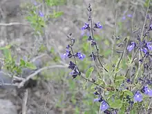 Salvia cuspidata subsp. gilliesii reaches up to 9 ft (2.7 m) in its native habitat—somewhat less in cultivation. New stems in early spring are light green and square, quickly becoming rounded, woody, and a soft gray color. The many upright stems in a small space give the plant a tall, airy appearance. The lanceolate-shaped, serrated leaves are graduated in size, with white undersides that have pronounced veining, and lightly cover the plant. There are 3–6 flowers in well-spaced whorls on branched inflorescences. The small flowers are 0.75 in (1.9 cm) long, and are a deep sky-blue with a purple undertone, held in a tiny calyx that is purple on the side turned to the sun and green underneath. The upper lip has a whitish dusting, the wider lower lip has two white lines that lead insects to the nectar.[2]