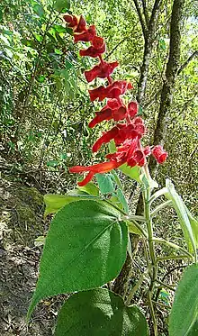 Salvia libanensis is a perennial shrub that is endemic to the northwestern slopes of the Sierra Nevada de Santa Marta in Colombia, growing at elevations between 2,000 to 2,200 m (6,600 to 7,200 ft). S. libanensis is a vigorous and spectacular plant reaching 3 m (9.8 ft) tall, with ovate leaves that are 7 to 12 cm (2.8 to 4.7 in) long and 3 to 8 cm (1.2 to 3.1 in) wide, hairy on both surfaces, with a paler underside. The inflorescence is of terminal racemes, with a 6 cm (2.4 in) red corolla.[1]