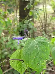 Salvia recurva grows to 6 feet high and 4 feet wide, and is covered with large ovate leaves that are 6 inches long and wide, with the back of the leaf having pronounced veins. The upper surface of the leaf is purple, along with the petiole, which can reach 6 inches long. Inflorescences reach 1 foot long, with flowers in whorls of 6–12, many of them blooming at once. When the inflorescence begins growing, all that can be seen are tightly packed lime-green calyces, which turn purple as the flower matures. The showy and elegant flowers are dark purple, reaching 2 inches in length, with the upper lip lightly covered in hairs, and the lower lip descending downward. The calyces are large, turning dark purple, along with the stem of the inflorescence.[1]