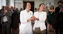 Wilkinson and Kitzinger said they were "deeply disappointed" with the judgement, not just for themselves, but for "lesbian and gay families across the nation".[25] They said that "denying our marriage does nothing to protect heterosexual marriage, it simply upholds discrimination and inequality" and also said that the ruling insulted LGBT people and treats their relationships as inferior to heterosexual ones; not worthy of marriage but only of an "expressly different, and entirely separate institution".[28][29] They said, however, that they believed the judgement "won't stand the test of time" and that they looked forward to the day when "there is full equality in marriage".[24] They had originally announced their intention to appeal the decision but later abandoned it due to lack of funds.[30]