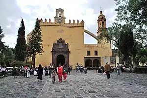The church was in charge of various communities outside Xochimilco proper, including Santiago Tepalcatlalpan, San Lucas Xochimanca, San Mateo Pochtla, San Miguel Topilejo, San Francisco Tlalnepantla, San Salvador Cuautenco, Santa Cecilia Ahuautla, San Andrés Ocoyoacac, San Lorenzo Tlatecpan, San Martín Tiatilpan, Santa Maria Nativitas Zacapan and Santa Cruz Acalpixcan, which are now in the boroughs of Xochimilco and Tlalpan.[3] As the population adopted Christianity, they were allowed to keep a number of traditional practices to mix with Catholic rites.[1] The best known of these traditions centers on the Niñopa, an image of the Child Jesus which dates to the 16th century. It and other images of its type were promoted by the evangelists to replace a cult to a child god which was prevalent in Xochimilco at the time of the Conquest of the Aztec Empire. Today, this image is cared for by one family for a year, changing houses on 2 February with this most important annual event of the borough occurring at this church.[4][5][6]