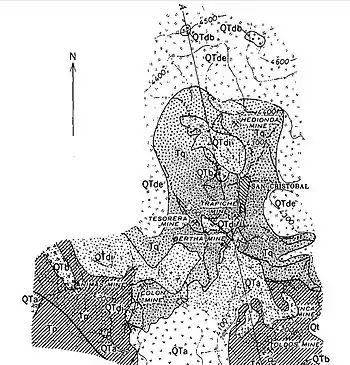 The geologic history from Tertiary and Quaternary periods includes 1) deposition and folding of the Potoco Formation, 2) erosion of this formation, 3) deposition of the Quehua Formation, 4) intrusion of the andesite porphyry stocks, 5) hydrothermal circulation altering rocks and depositing oxide-siderite-barite veins containing silver, 6) intrusion of dacite porphyry stocks, uplift of the Potoco and Quehua Formations, and deposition of dacite porphyry lava flows, 7) intrusion of breccia pipes and faulting, 8) deposition of dacite tuff, 9) hydrothermal circulation altering rocks and depositing galena, sphalerite, pyrite, native silver and barite, 10) erosion.[4]: 10