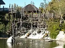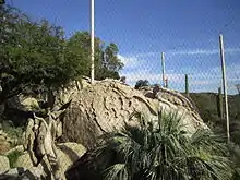 Opened in October 2004, Lion Camp houses the park's six African lions, Izu, Mina, Oshana and Etosha in a 1-acre (0.40 ha) exhibit.[27] The park's two other lions, Ernest and Miss Ellen, were moved to the San Diego Zoo. One side of the enclosure is dominated by an artificial rock kopje which has a 40-foot-long (12 m) glass viewing window and heated rocks.[27] The path continues along an acacia-studded ravine and leads to a replica observation tent. This has a smaller viewing window as well as a Land Rover for the lions to rest on.