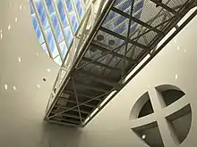 The expanded building includes features such as a large-scale vertical garden on the third floor, purported to be the biggest public living wall of native plants in San Francisco; a free ground-floor gallery facing Howard Street with 25-foot (7.6 m) tall glass walls that place art on view to passersby; a double-height "white box" space on the fourth floor with sophisticated lighting and sound systems; and state-of-the-art conservation studios on the seventh and eighth floors. The expansion facades are clad with lightweight panels made of Fibre-Reinforced Plastic; upon completion, this was the largest application of composites technology to architecture in the United States at the time.[35] The building achieved LEED Gold certification, with 15% energy-cost reduction, 30% water-use reduction, and 20% reduction in wastewater generation.[36] The Botta staircase was removed.