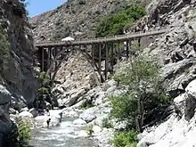 Below the Fish Fork the East Fork flows through the "Narrows", one of the deepest gorges in Southern California.[10] From the floor of the canyon at 3,000 feet (910 m), Iron Mountain rises 8,007 feet (2,441 m) to the southeast, while Mount Hawkins, 8,850 feet (2,700 m), rises to the northwest.[11] The Iron Fork tributary joins from the west roughly in the middle of the Narrows.[11] Near the lower end of the Narrows, the river passes under the Bridge to Nowhere, a 120-foot (37 m) high arch bridge that was abandoned after the huge flood of 1938 washed out a highway under construction along the East Fork. The bridge remains today as a popular destination for hikers and bungee jumpers.[12]