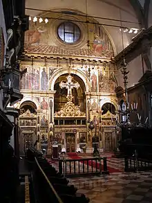 Between 1560–1583, Michael Damaskinos completed works for the church. Twenty-five of his major works are located in Venice. Twenty of his paintings are part of San Giorgio dei Greci. Eighteen of his icons are part of the iconostasis of the church. One of them portrays the Archangel Michael. Nine of the paintings exhibit the dodekaorto known as the Great feasts in the Eastern Orthodox Church. Two of his works are behind the iconostasis within the holy sanctuary. Four of his works are part of the Hellenic Institute of Venice. The museum and research facility is associated with San Giorgio dei Greci. One of his paintings Wedding at Cana is located at the Museo Correr in Venice.[3]