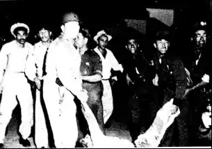 The next day, on October 27, the police fired upon a caravan of Nationalists in the town of Peñuelas, and killed four of them. This police massacre inflamed many in Puerto Rico, and the outcry was immediate. The first armed battle of the Nationalist uprisings occurred in the early morning of October 29, in the barrio Macaná of town of Peñuelas. The insular police surrounded the house of the mother of Melitón Muñiz Santos, the president of the Peñuelas Nationalist Party in the barrio Macaná, that Muñiz Santos was using as a distribution center for weapons for the Nationalist Revolt.[13] Without warning, the police fired upon the Nationalists in the house and a firefight between both factions ensued, resulting on the death of two Nationalists and wounding of six police officers.[14] Nationalists Meliton Muñoz Santos, Roberto Jaime Rodriguez, Estanislao Lugo Santiago, Marcelino Turell, William Gutirrez and Marcelino Berrios were arrested and accused of participating in an ambush against the local insular police.[15][16]