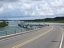 The San Juanico Bridge[6] (Filipino: Tulay ng San Juanico; Waray: Tulay han San Juanico) is part of the Pan-Philippine Highway and stretches from Samar to Leyte across the San Juanico Strait in the Philippines.[2] Its longest length is a steel girder viaduct built on reinforced concrete piers, and its main span is of an arch-shaped truss design. Constructed during the administration of President Ferdinand Marcos through Japanese Official Development Assistance loans,[7] it has a total length of 2.16 kilometers (1.34 mi)—the second longest bridge spanning a body of seawater in the Philippines after the Cebu-Cordova Bridge. It was also the longest bridge in the Philippines upon its opening in 1973, surpassed in 1976 by Candaba Viaduct of North Luzon Expressway (NLEX), another bridge that connects from one province to another, connecting the provinces of Pampanga and Bulacan.[8][9]