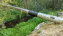 San Mateo Creek's source elevation is at almost 1,000 feet on Sweeney Ridge from which it flows southeasterly (in a valley east of Cahill Ridge and west of Sawyer Ridge) for 11.2 km (7 mi) before entering the northwest arm of Lower Crystal Springs Reservoir. The northeast arm of Lower Crystal Springs Reservoir is formed by San Mateo Creek's tributary, San Andreas Creek which descends to the Reservoir southeast along the San Andreas Rift. Another tributary, Laguna Creek, flows northwards from Woodside with its source on Edgewood County Park and Natural Preserve, and historically fed Laguna Grande and then joined San Mateo Creek just upstream from Crystal Springs Canyon, where San Mateo Creek turned east to flow through the canyon. Laguna Grande was submerged when an earthen dam (this was the first Crystal Springs Dam) was constructed in 1877, forming Upper Crystal Springs Reservoir.[10][11] The old earthen dam became a causeway between Upper and Lower Crystal Springs Reservoirs when the latter was formed by Herman Schussler's concrete Crystal Springs Dam, which dammed up San Mateo Creek in 1888 to form the lower reservoir.[12] The causeway is now crossed by Highway 92. In addition to San Mateo Creek and its San Andreas Creek and Laguna Creek tributaries, the waters of Crystal Springs Reservoir consist of runoff from the eastern slopes of the Montara block of the Santa Cruz Mountains and imported Hetch Hetchy Aqueduct water deriving from the Sierra Nevada. The two Crystal Springs lakes and San Andreas Lake used to be known as Spring Valley Lakes for the Spring Valley Water Company which owned them. Lower Crystal Springs Reservoir now covers the town of Crystal Springs which grew up around a resort of the same name.[6]