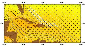 Wind and wave action in San Salvador is influenced by the Antilles Current. The Antilles Current originates south of the Bahamas, Puerto Rico, and Cuba and moves northward where it merges with the Gulf Stream.[9][10] This current cools the waters around San Salvador in the summer and warms the water around the island in the winter. This keeps the water temperature relatively mild and consistent throughout the year.[7]
