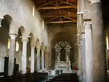 The interior has a nave and two aisles, divided by columns with ancient Roman capitals, with hut-shaped ceiling. It houses also an Arabic tombstone, the copy of a 14th-century Madonna with Child and the rudder of a Pisane galley (13th-14th centuries).