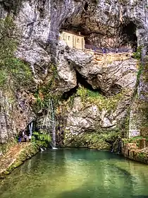 The Santa Cueva de Nuestra Señora de Covadonga (English: the Holy Cave of Our Lady of Covadonga) is a Catholic sanctuary located in Asturias, northern Spain.[1] It is a cave in the Picos de Europa mountains, which gives its name to the parish of Covadonga in the municipality of Cangas de Onís. The name refers to the sanctuary, dedicated to the Virgin of Covadonga, where the first battle of the Spanish Reconquest took place in 718.