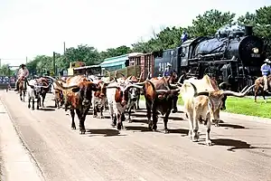ATSF No. 3415 passing by some cattle walking in Abilene, Kansas