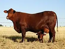 The Santa Gertrudis is an American breed of beef cattle. It is a taurine-indicine hybrid breed, descended from both zebu and European cattle. It was bred in the early twentieth century in Texas, and received official recognition in 1940. It has been exported to many countries including Australia, Brazil and South Africa, and has contributed to the development of a number of modern breeds, among them the Barzona[3]: 290 and the Droughtmaster.[4]: 721