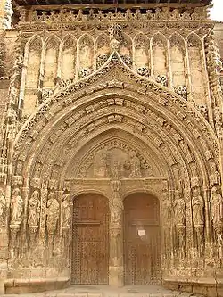 The church was begun originally in Isabelline Gothic style in the late 15th century, but work continued until the 18th century. The main gothic portal is highly sculpted with angels, floral motifs, and a scene of the Annunciation in the tympanum. The church lost much of its interior decoration and azulejo tile during and after the Spanish Civil War. The church is also used for concerts. It was declared a national monument in 1931.[1]