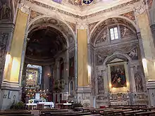 The presbytery includes frescoes (1626) by Giulio Orlandini. The large and crowded fresco of the Trinity with angels and with the Ascended Virgin and saints in Paradise (1626-1629) covers the cupola, and was work by Pier Antonio Bernabei and his pupils: his brother Alessandro and Giovanni Maria Conti della Camera. The decoration of the chapels occurred in nineteenth centuries, and has works by Tommaso Bandini, Giovanni Gaibazzi, Francesco Scaramuzza, and Francesco Pescatori.[1]