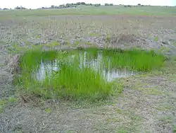 A vernal pool is a shallow depression in the soil which fills up with water during spring rains. Fairy shrimp and other minute crustaceans hatch during this time and lay eggs. These eggs remain dormant during the dry months until the next rainy season allows them to hatch. (6)