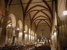 The impressive interior is the result of major restoration in the 1950s. It returned the building to a severe appearance and with harmonious embellishments previously distorted by the sixteenth and seventeenth centuries. The pillars and columns support the many arches that lead to the apse. The plastered roof vaults date from the late fourteenth century renovation of Bishop Stephen from Carrara. The aisles end in a sort of ambulatory, interrupted by the large niche at the top of the apse, where the tabernacle was placed.[1]