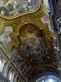 On the 16th century pavement, many tombs are found, including that of Belisario Corenzio, who died in a fall from the scaffolding while he frescoed the vault of this church.[23] After much of the ceilings collapse in the 1731 earthquake, they were refrescoed by Francesco De Mura, who also painted the counterfacade (1739) and Giovanni Paolo Melchiorri, who painted the choir ceiling with a Glory of St Benedict.[24] The stucco of the nave was completed by Giuseppe Scarola. The Sacristy conserves a complete cycle of frescoes by Onofrio De Lione, brother of Andrea and student of Corenzio. Onofrio painted the Old Testament Scenes (1651). The Trinity fresco was painted by Corenzio