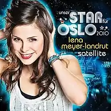 "Satellite" was Germany's entry for the Eurovision Song Contest 2010. By representing a "Big four" country, it was automatically qualified for the final. Germany received a wild card during the running order draw, which allowed the German representatives to pick the country's position for the final. They chose position 22 out of the 25 spots. Meyer-Landrut arrived one week before the show in Oslo, Norway, where she completed five rehearsals of "Satellite". Prior to the final, the song was considered as one of the favourites. Bookmakers regarded it second favourite behind Azerbaijan's "Drip Drop", while Google projected it would win based on search volume in the participating countries.[29][30] According to Norway's Aftenposten, Meyer-Landrut received the most attention of all participants.[31]