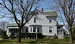 The Sauser–Lane House is a historic building located in Cascade, Iowa, United States. Michael H. Sauser had been an area farmer and owned a Cascade lumber business when he built this house in 1908. It is the only known example of the Grand Rapids, Michigan mail order architectural firm of Jacob H. Daverman and Son in Iowa.[2] Sauser lived here until his death, and it was bought by John Thomas Lane in 1926. As of 1983 it was still owned by his descendants. The 2½-story frame house is a combination of Neoclassical and a restrained version of the Queen Anne style known as Edwardian. The Edwardian influence is found in its asymmetrical massing, roof lines, bay windows, wraparound porch, gable ornamentation, roof cresting, and the leaded glass in the upper sash of the front windows. The Neoclassical influence is found in the window trim, cornice returns, and the Doric porch columns. The house was listed on the National Register of Historic Places in 1983.[1]