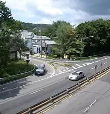 Crossing south of Bedford Hills Memorial Park, the Saw Mill River Parkway enters the hamlet of Bedford Hills. In Bedford Hills, the parkway enters Exit 39, which connects to the hamlet and NY 117 (Bedford Road). Also present at this interchange is the Bedford Hills Metro-North station. The parkway divides once again through Bedford Hills, paralleling NY 117 through the community. The parkway then enters Exit 42, an interchange for NY 117 and Railroad Avenue. At Harris Road, NY 117 crosses over the parkway, paralleling the northbound lanes of the Saw Mill River Parkway on a nearby bypass. NY 117 soon merges into the Saw Mill River Parkway (Exit 43 southbound) before the Saw Mill River Parkway enters the right-of-way for Interstate 684, where the parkway terminates just east of Katonah.[3]