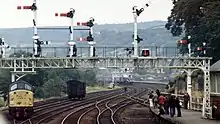 From 1907 until 2010, the station approaches were controlled from a 120-lever signal box named Falsgrave; this is sited at the outer end of platform 1 and close to the former excursion station at Scarborough Londesborough Road. In its final years, Falsgrave box controlled a mixture of colour-light and semaphore signals, including a gantry carrying 11 semaphores. The signal box was decommissioned in September 2010 and the gantry was dismantled and removed in October 2010. Its new home is at Grosmont railway station, on the North Yorkshire Moors Railway. The new signalling is a relay-based interlocking with two- and three-aspect LED signals controlled from an extension to the existing panel at nearby Seamer.[4][5] Simplification of the track layout and major renewals took place at the same time.